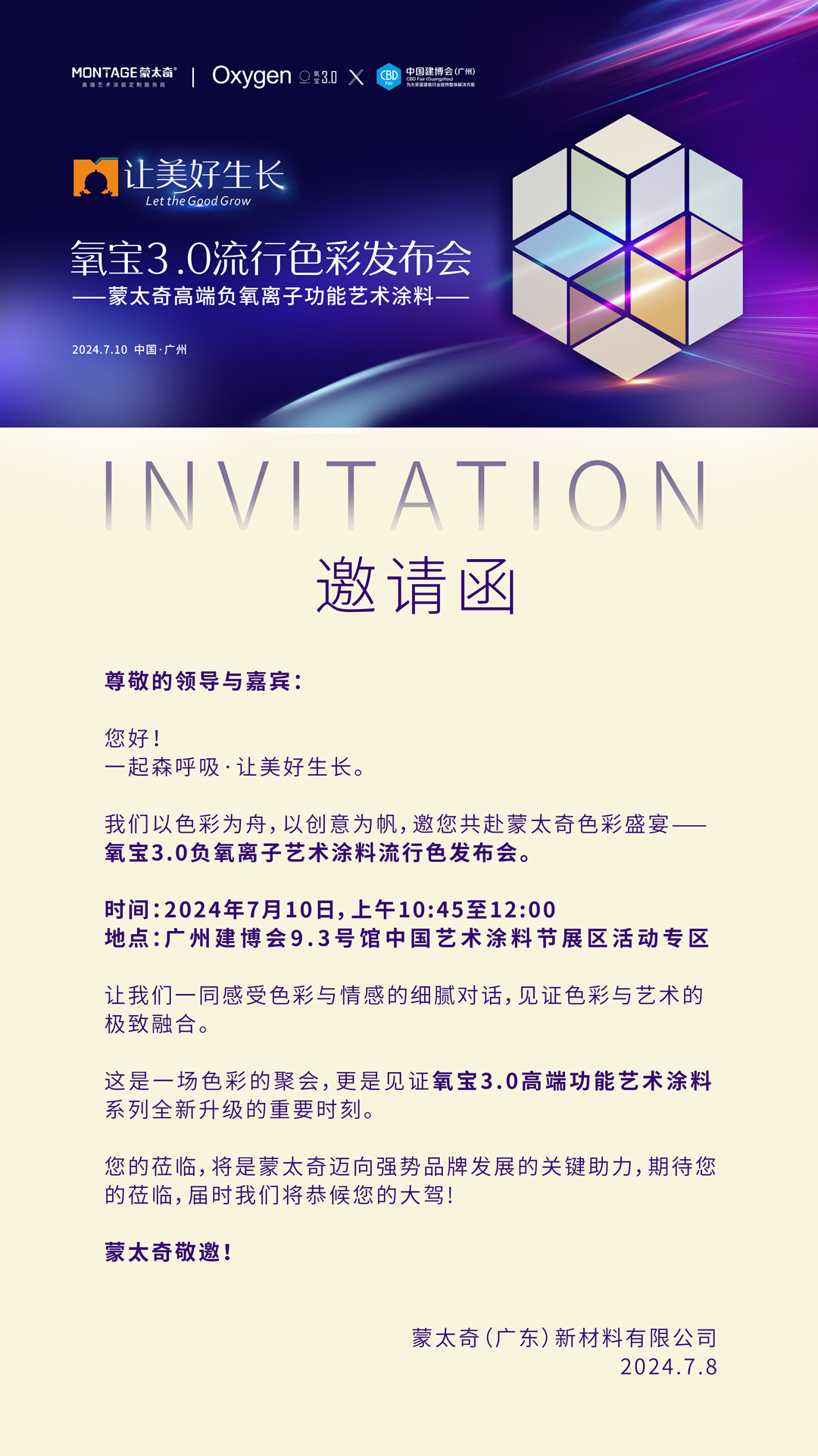 本次展會中,備受期待的蒙太奇氧寶3.0負氧離子藝術涂料流行色發布會,定于7月10日早上10:45至12:00正式啟幕,屆時揭秘氧寶3.0負氧離子藝術涂料技術與色彩蛻變的力量。誠邀您一起探索,從色彩的應用,感知家居美學。