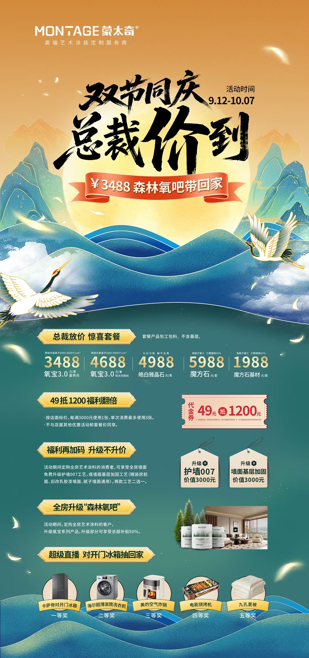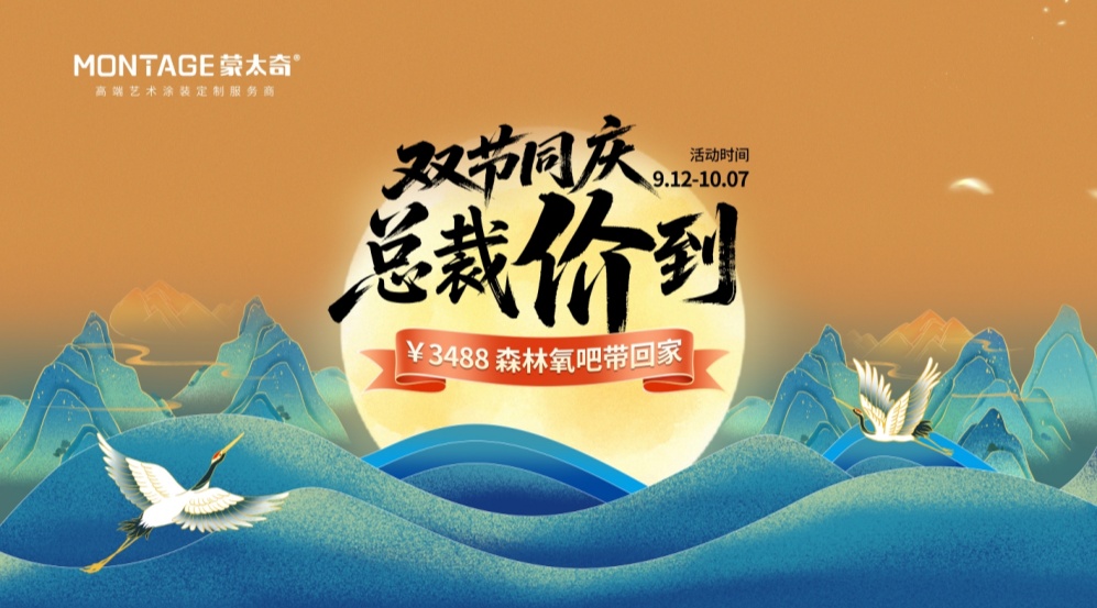 權威認證與硬核技術的雙重保障,讓蒙太奇藝術漆成為高端家裝市場的環保首選。值此國慶佳節,蒙太奇特別推出“雙節同慶,總裁'價'到”大促活動。即日起至10月7日,消費者可享49元抵1200元代金券、全房升級氧寶“森林氧吧”鉅惠(升級部分可享總部補貼50%)、直播間抽對開門冰箱等多重福利。優惠名額有限,請前往全國蒙太奇門店鎖定福利,讓這個國慶,輕松打造綠色森林之家。
